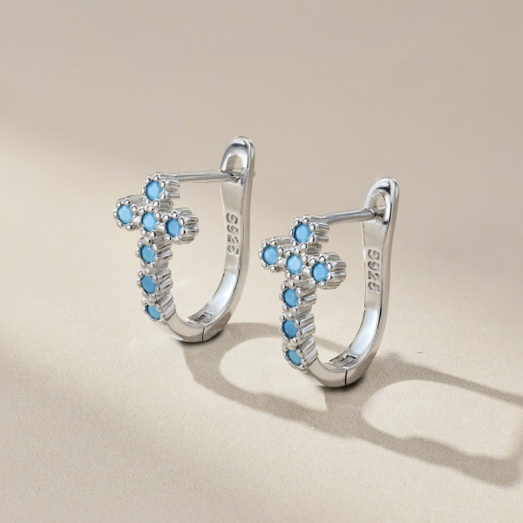 Elevate your style with the 925 Sterling Silver Sacred Cross Earrings, a beautiful product that blends timeless elegance with a touch of spiritual significance. These 925 sterling silver hoop earrings feature an intricate cross pattern inlaid with vibrant turquoise, adding a pop of color and symbolism to your look.