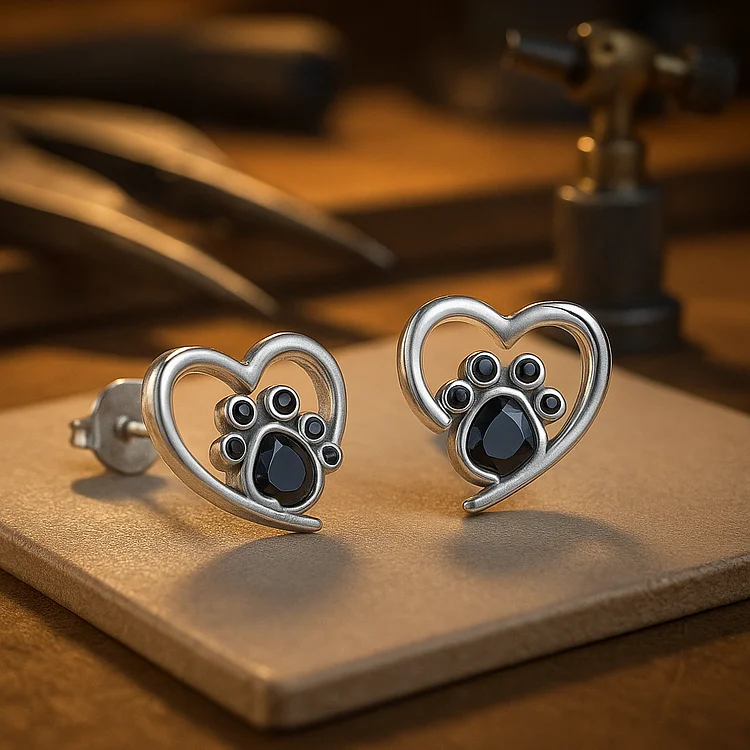 Heart Paw Stud Earrings – Silver with Black Enamel