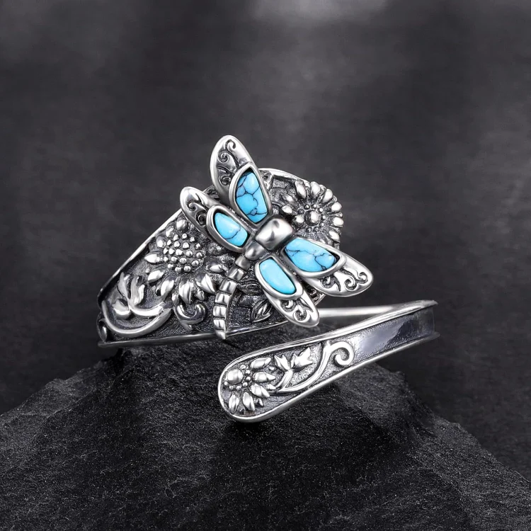 Inspired by antique silverware patterns, each ring features your choice of an oxidized dragonfly - symbol of transformation, freedom, and natural beauty. The carefully wrapped band creates a comfortable, adjustable fit, perfect for wearing as a thumb ring or statement piece on any finger.