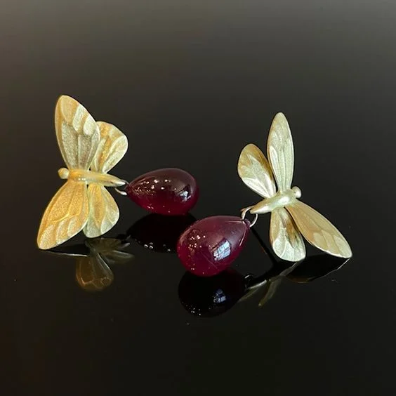 Vintage Golden Butterflies Ruby Drop Earrings